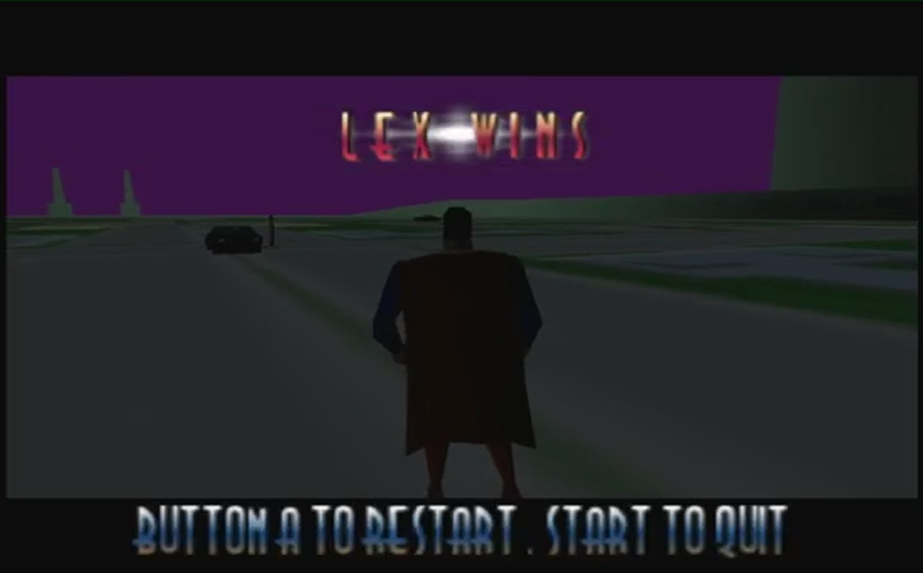 After failing at the Stargate maze two more times, I finally reach the cars. “Now I’m armed with the official controls,” I think to myself. “Maybe I should land to deal with this!” Nope. The game gives me all of its nopes as Superman proceeds to have seizure. This wasn’t the worst part though, apparently I lost due to an arbitrary ****ing time limit, because this is my Game Over screen: