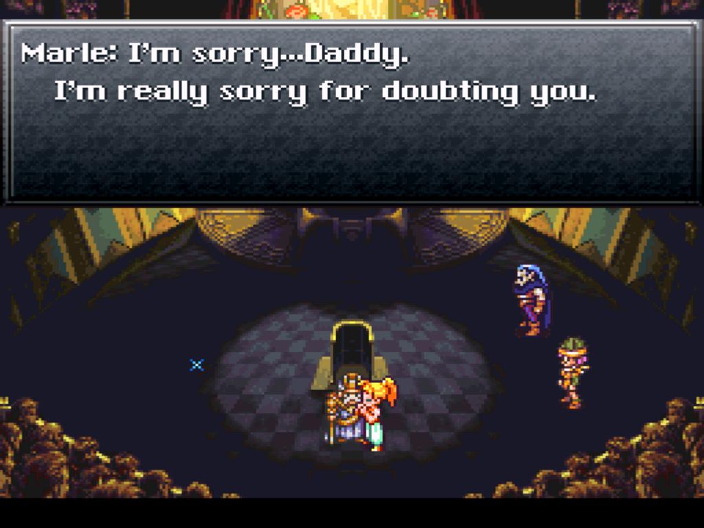 Marle finally ran out of her castle in a huff and the adventure wore on without a welcome mat at Guarida Castle. At one point, Marle offers up some beef jerky as a token of good will but the King yells at her for not considering his cholesterol! When the King is put on trial for stealing important heirlooms, Marle returns to right his name and the two make up. Finally, her father reveals he was there for her mother’s last words, which, of course, were about Marle and her future love.