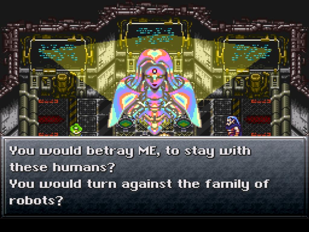 Yes, robots can have issues, especially if your mom is named Mother Brain and wants to take over the world. Robo was created for the sole purpose of destroying humans, but he experienced robot amnesia and forgot all that and instead tried to save humans. This created quite the conundrum later on when he met his sister/girlfriend/robot Atropos in the Geno Dome who still wanted to destroy all humans.
