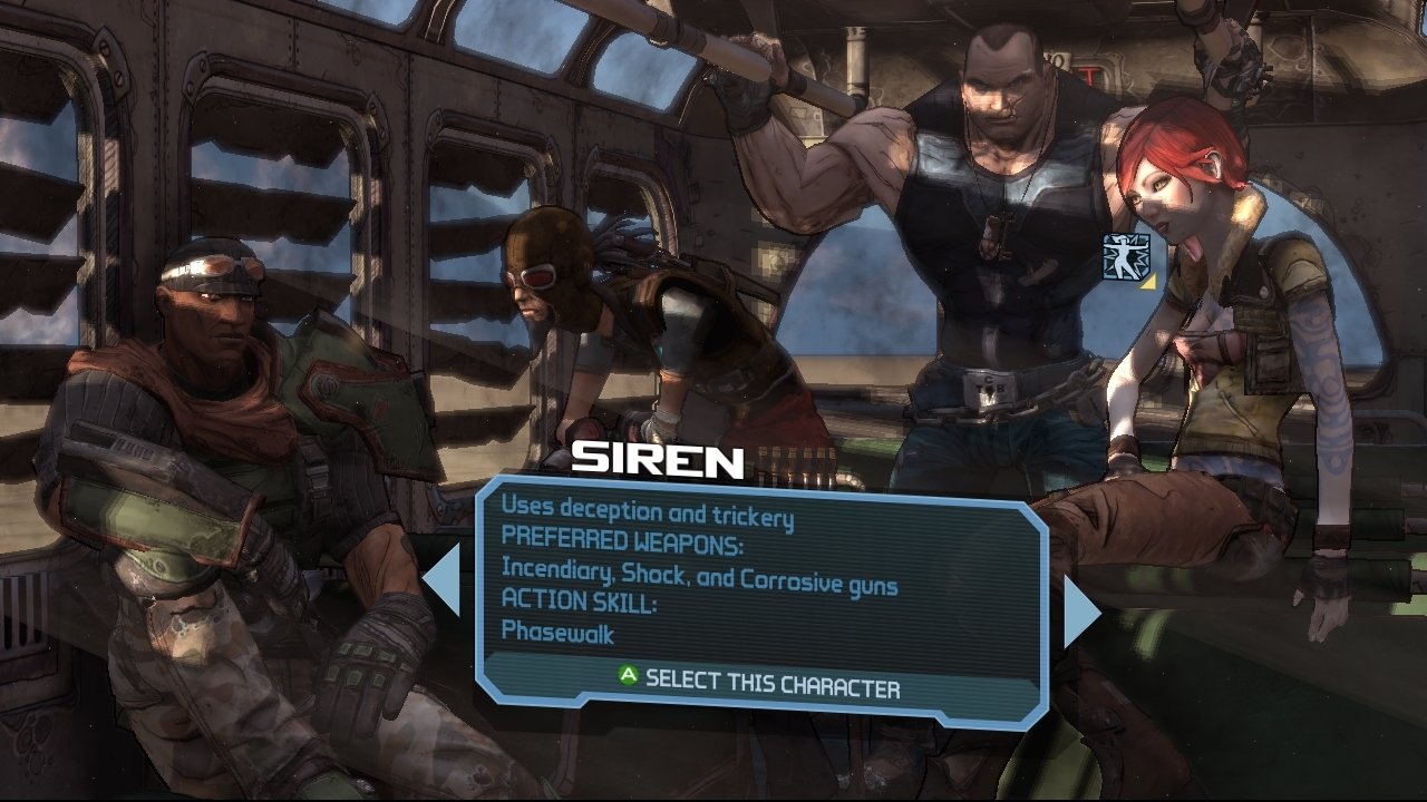05 – Roland “The Soldier” looks to be a loner, shying away from the camera, wearing combat armor, he’s clearly the “guns” guy. Lastly we see Brick “as Himself”. Brick is enormous, with a tank top and a skinhead. He looks like he could literally break you in half with his bare hands and eat you without a care. The music starts to fade and the raspy voice comes back. It’s the bus driver. We learn his name is Marcus. “Next stop, Fyrestone Depot, time to get your stuff, who’s getting off?” Now we get the choice of character: Soldier, Hunter, Berserker, or Siren. I choose Siren because I’m curious about this invisibility and it says her weapon of choice is Sub-Machine guns, which happens to be the best type of gun. Fact.