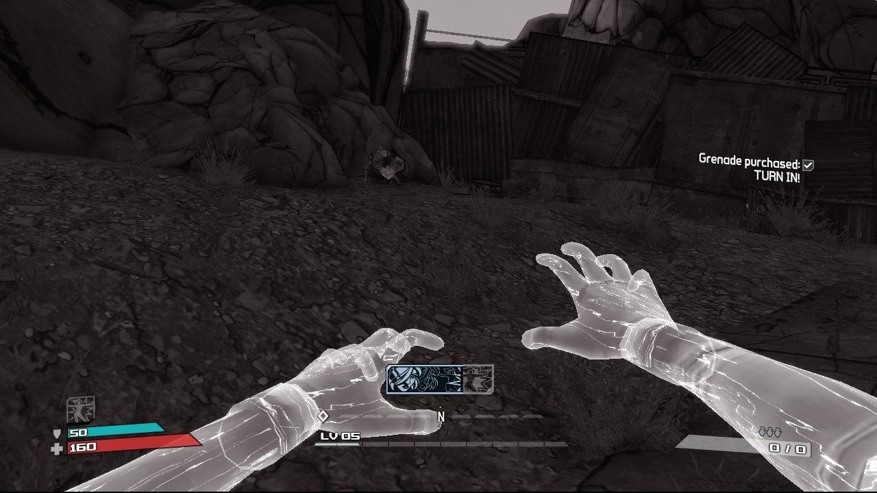 07 – I step off the bus, just outside of a dusty shanty town. The bus drives away in a cloud of smoke. I’m all alone. I turn (look only control), and see a robot waving the bus off. He comes up to me and introduces himself as CL4PTP and tells me to call him “Claptrap”. He hands me a device, a heads up display and echo communication device provided by the Dahl corporation.