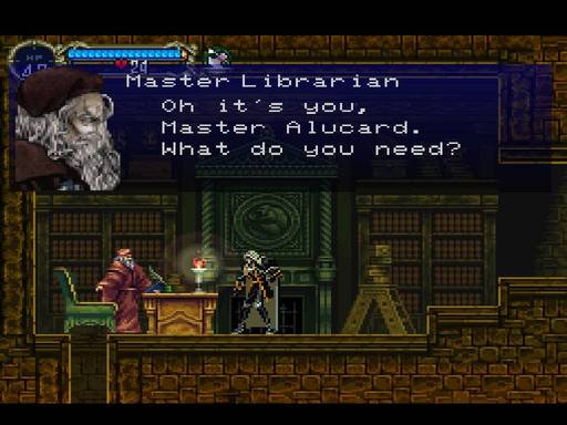 42 - I find the shop! I can finally spend all my hard earned cash. The master librarian is just chilling out above a hole in the floor in the middle of Dracula's castle! This geezer is a brave man! He seems to know Alucard, maybe I missed something in the opening text? Did Alucard use to chill out here? Must be the cursed bloodline. If Alucard used to live here, why don't I already have a map of my old place? Anyways, I buy a shield and a hat, all I can afford that will help me out.