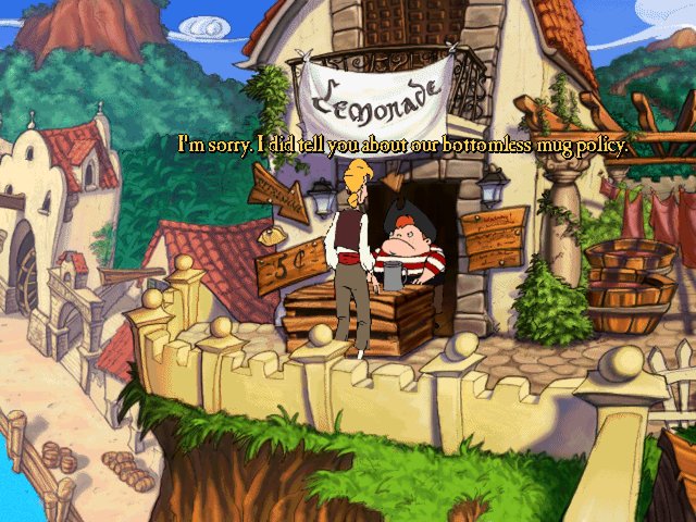 was a travesty of polygons and bad art direction). The game has a great cartoony look that works really well for the style of gameplay. The best part though is the voice acting. The first two Monkey Island games were text only, so making the jump to both big, cartoon sprites AND 100% voice acting was a huge step, and it was totally in the right direction. Guybrush Threepwood's voice, Dominic Armato, was the absolute perfect cast for the bumbling but lovable wannabe pirate. He has to carry the game and it works for at least the first hour.