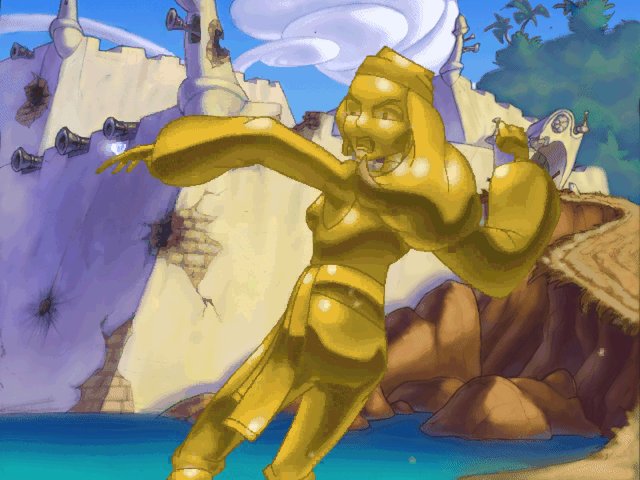 35 - Guybrush tells the lady about his girl problems and she gets pissed that I left such a valuable gold statue on the beach! The game cuts to the beach - Elaine is gone and there's a ship sailing away. The game cuts back to the voodoo house and the priestess explains that it was probably the thugs parked in Danjer Cove who stole her.