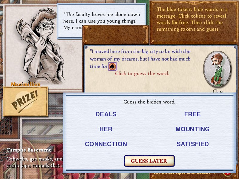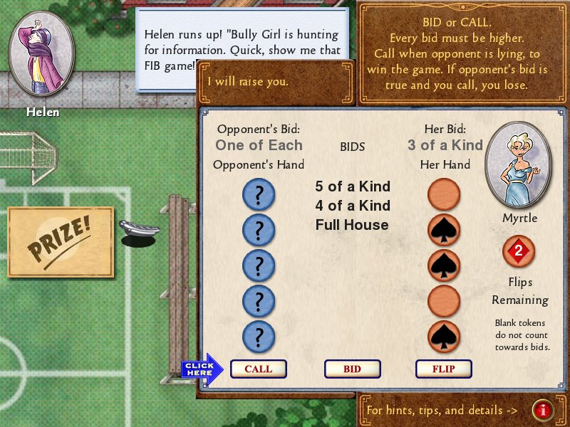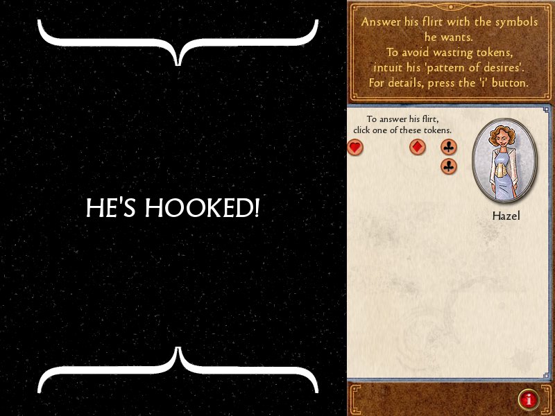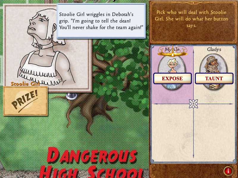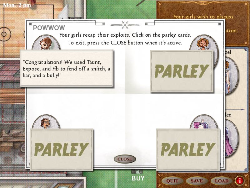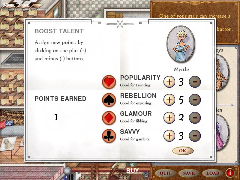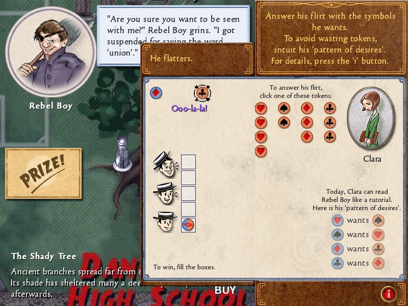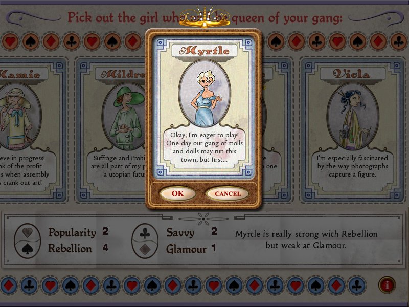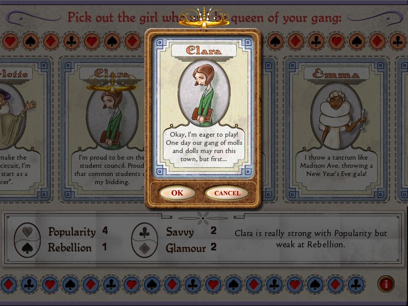 I'm not sure how much I like the isometric view of the school in Dangerous Girls. It's at such a dramatic angle everything looks stretched. Fortunately, the focus is typically on the character cards and the current game at hand, and that looks pretty good. The characters are well detailed, especially the non-player characters. While playing the games, things can feel a bit crowded but I looked for something that didn't belong and couldn't find anything. I think it's just that feeling from the stacking graphics that you don't see that often these days. The music is a collection of snippets of well known parlor songs from the period, nothing lasts too long and you're usually in silence. Not that big of a deal though.