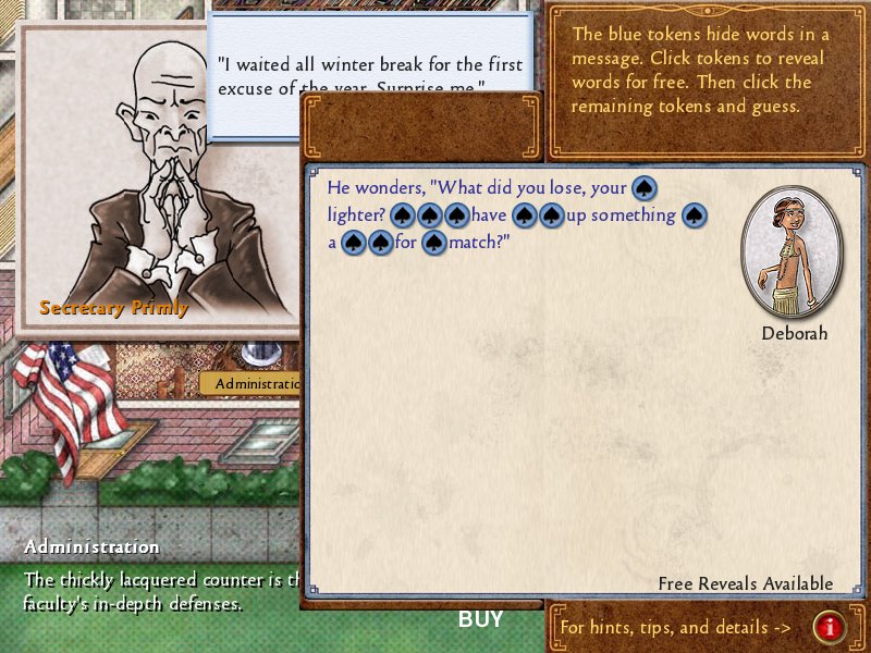 29 - Helen parleys with the secretary, a scroogy looking old guy. He says to meet the new janitor, we need a hall pass, and will have to take him on a fib, expose, or taunt. Guess I'll try fibbing with Gladys.