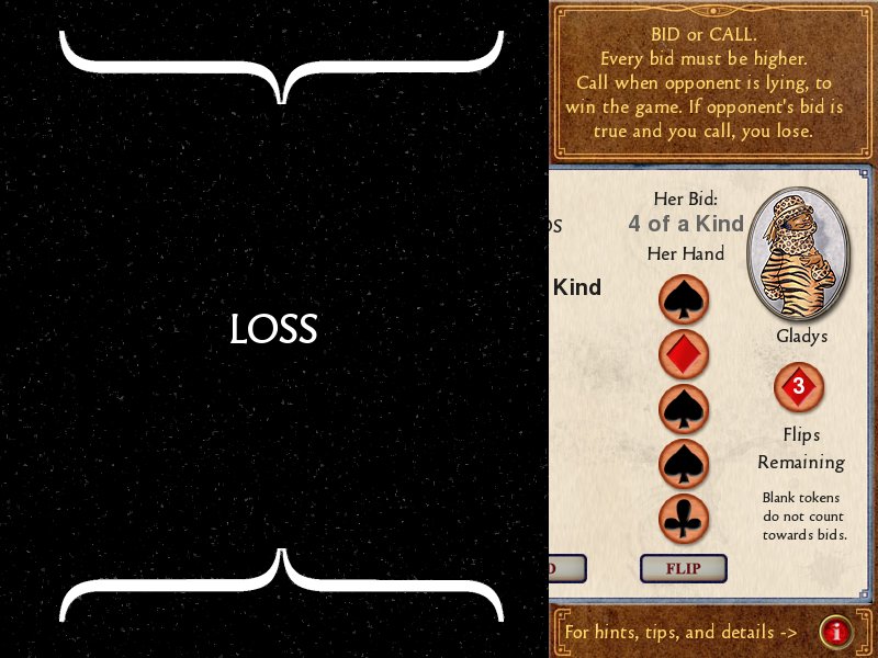 47 - I lose a game of exposing but get a full house in a game of fib... this could be it!! He says he has four of a kind, I call. I got him!