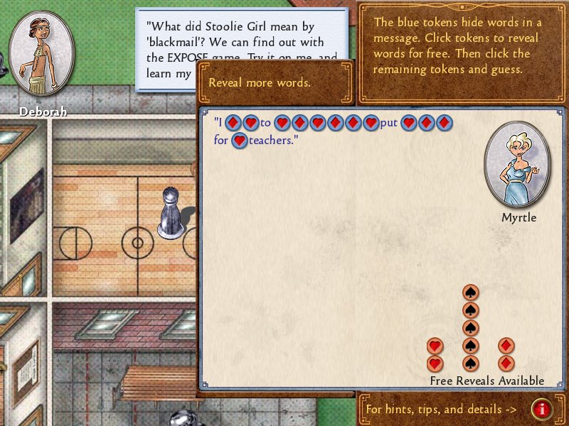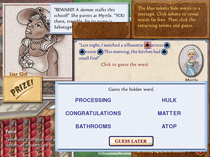 22 - Ouch, my first loss, guessed the wrong word. Not sure if I was punished any way though. I take it to the hallways where Liar Girl is also stalking. Ah, seems to be the same expose!