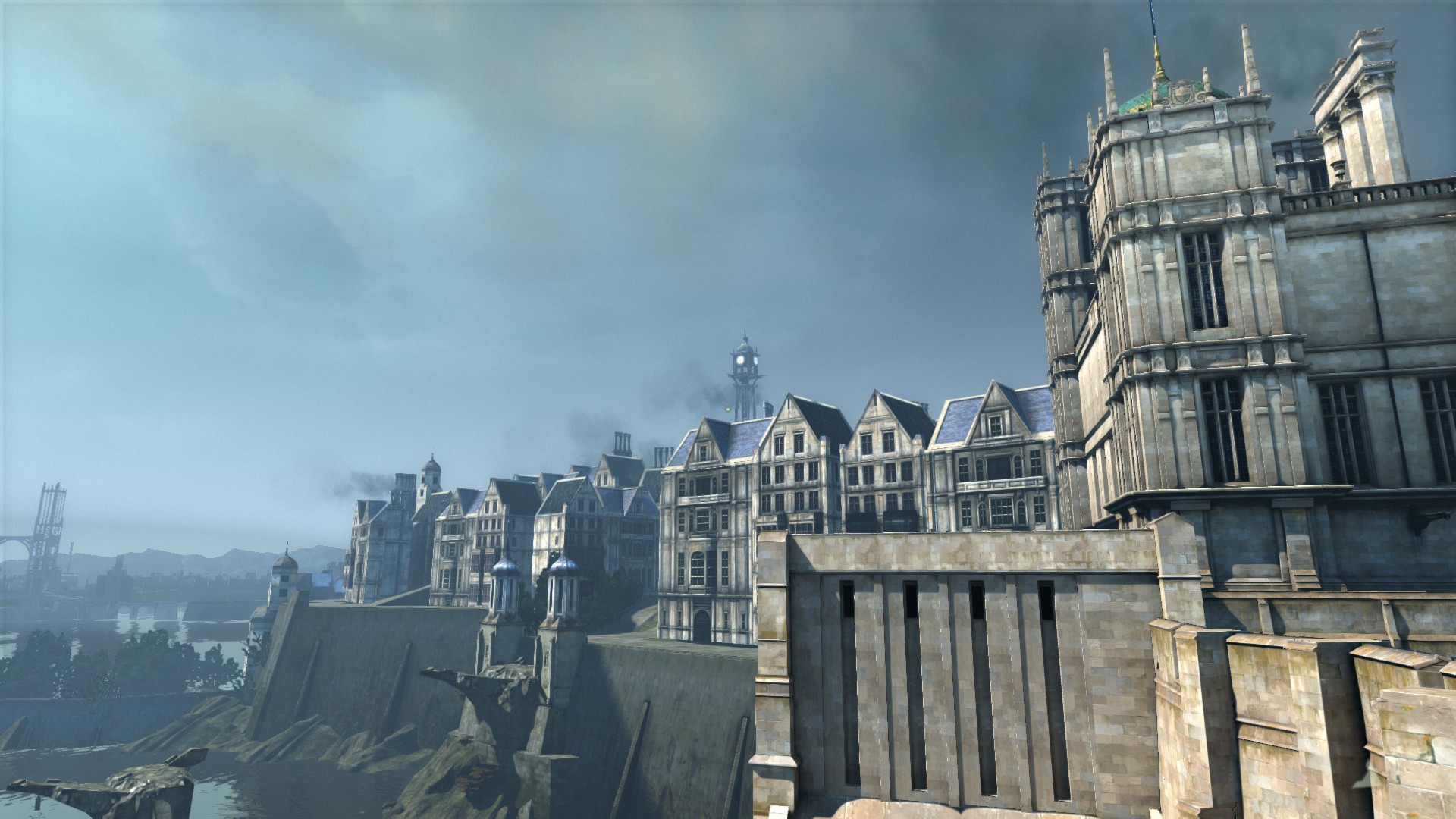 Before getting into the review-proper, I want to touch on the design and visual presentation; its uniqueness begs prying eyes to observe. Dunwall, the city setting in Dishonored, is designed by the very same man who imagined City 17 in Half-Life 2. Visually, I get the sensation that Arkane started with something relatively gritty, and then moved the entire art-style in the direction of pastel and caricature. It’s just utterly dripping with style and brave design choices. The character design in particular is especially reminiscent of old political cartoon artwork, with all the exaggerated features necessary to convey a character without words.
