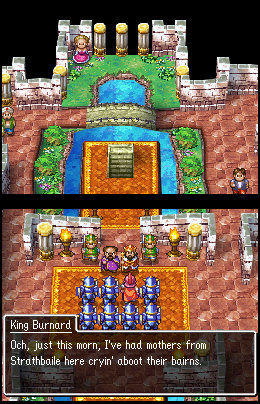 09 - I’m greeted by a screen that says “Chapter 1: Ragnar McRyan and the Case of the Missing Children.” I’m pretty sure Phoenix Wright had this case already. I’m taken to the Kingdom of Burland, where shockingly enough, children have gone missing. The king tells his knights to get to the bottom of this mystery, my character being one of the knights. The other knights have this cool blue armor, but mine is pink for some reason. I get control of my character, Ragnar, and talk to the king. Everyone here has incredibly strange accents. Either that, or the localization team for this game is terrible.