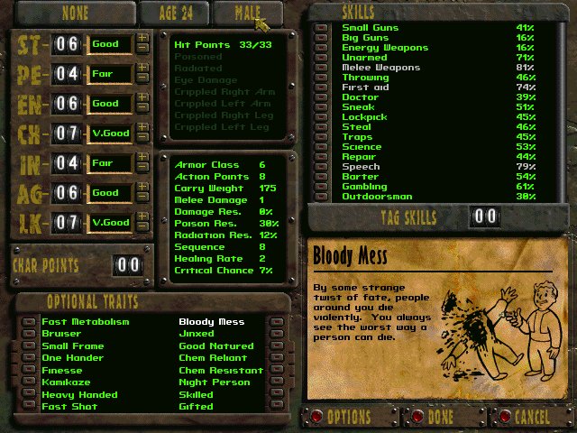 02 - I pick an optional trait of Bloody Mess, "by a strange twist of fate, people around you die violently." Sweet! I also up my melee weapon, first aid, and speech skills.