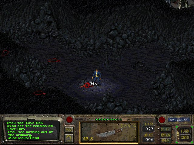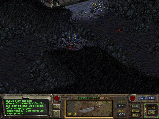 Fallout is a graphically dark game, I had trouble seeing rats in the caves and buildings and it was sometimes difficult spotting key objects. Other than that, I can't really complain too much. The isometric view isn't the greatest but it works for the game and made sense to use at the time. The sprites are actually decently detailed, even if everything looks a little muddied.