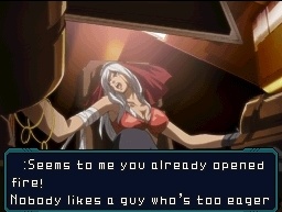 09 - An unidentified ship appears, piloted by a woman named Nia. She flings a few double-entendres as she flies by, and the battle begins, only this time I'm playing as her ship.