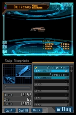Design: The graphics aren't great, even for a DS game. The anime sequences are good, but the ships in battle are blocky and low-res. Also, a lot of the sequences just have a picture of Yuri on the top screen while something plays out on the bottom screen. This could have cool if it weren't always the same picture. The music is catchy, I found myself humming along at one point.