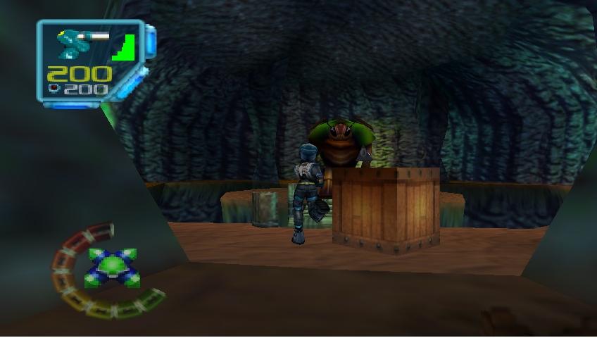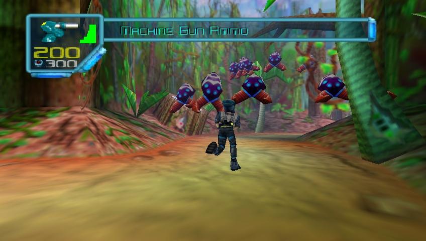 The characters are probably the best looking things in this game, they're relatively detailed and Juno and Vela specifically look really good. After that, everything kind of goes downhill. The 3D areas seem pretty large, but Jet Force Gemini employs some really awful looking textures all over which spoil the expansiveness. There was a decent variety of environments in the first hour; though I spent the most time in the forest, the last few minutes placed me in a large spaceship cargo deck. I actually enjoyed the music so that helps out this category's score. The sound effects were typical but the soundtrack seemed above average. But Rare has always had pretty good music in their games. Oh, one note, Jet Force Gemini runs in widescreen mode (as you can see by the screenshots in this review), this is a great method of future-proofing by Rare.