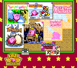 00 - I start a new game and I'm immediately offered a colorful menu with many options of games! There's Spring Breeze, Gourmet Race, Dyna Blade, The Great Cave Offensive, Megaton Punch, and Samurai Kirby. Milkyway Wishes and Revenge of the Meta Knight are also there but they're grayed out and unavailable at this time. I decide to go with Spring Breeze, the easiest one.