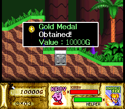 51 - The Great Cave Offensive is undoubtedly one of the coolest games in Kirby Super Star, as you play as a treasure hunter. Now I think treasure hunters are awesome and so this game takes the cake. There are 60 treasures to find in this world, and some of them are pretty challenging! My first treasure is a Gold Medal, worth 10,000G!