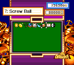 60 - Well, my first hour is up and I finish the Great Cave Offensive with the first nine treasures in my back pocket! A gold medal, a gold coin, a whip, crystal ball, lucky cat, Seiryu Sword, the Screw Ball (from Metroid), echigo candy, and a zebra mask. Not a bad haul, too bad there's no time left! Oh yeah, 726,300G in booty!