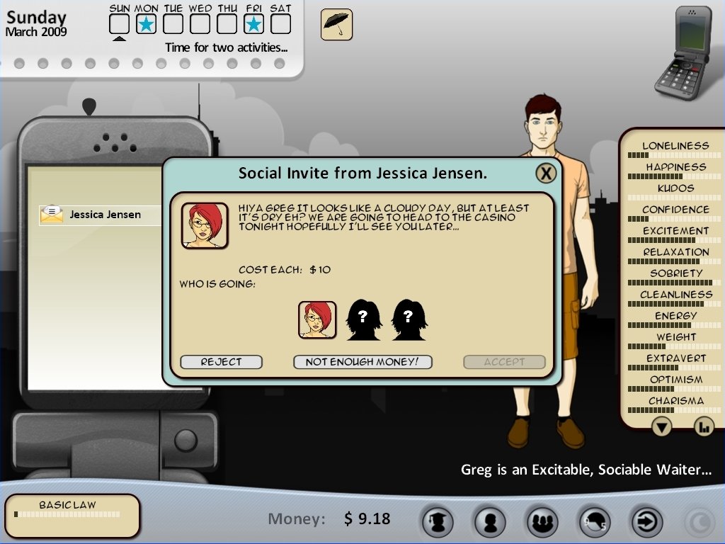 23 - Jessica invites me to go to the casino on Sunday... but it costs $10, and I only have $9.18! Crap, can't go.