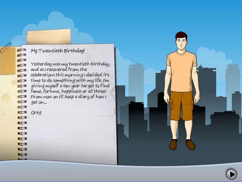 03 - Greg writes himself a note, it's his 20th birthday and he's setting a ten year goal of fame, fortune, or happiness. I don't remember my own 20th birthday... I probably had a college math final or something that day.
