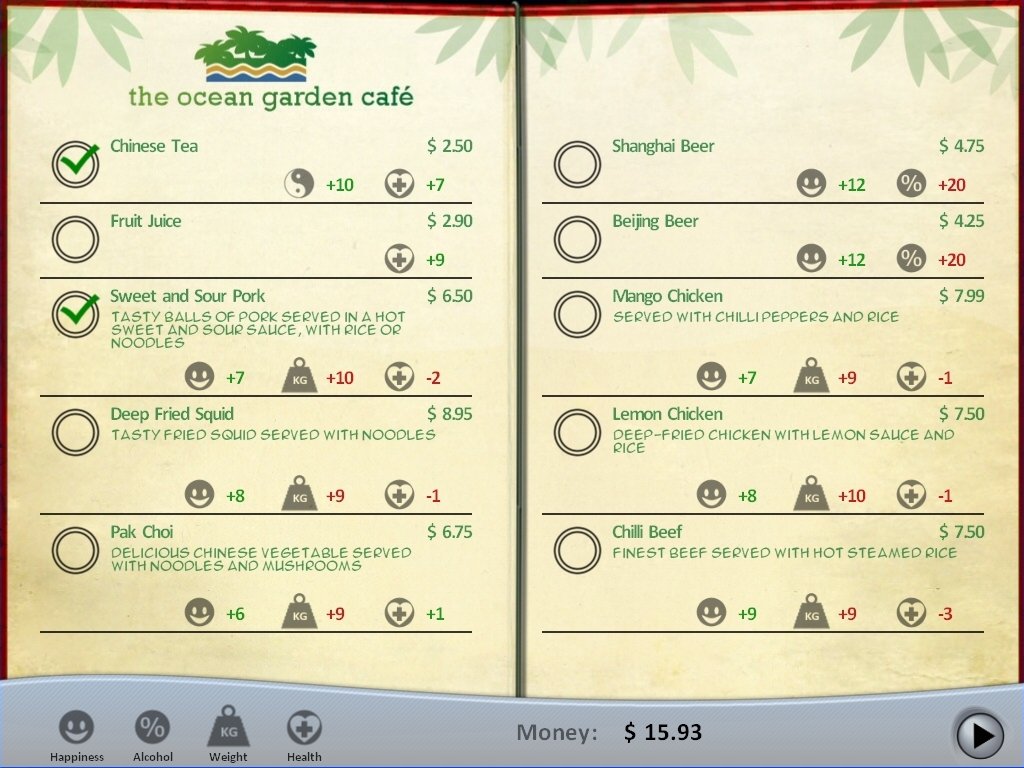 38 - Veronica won't go out with me tonight, so I ask Kim to a Chinese restaurant. Wow! I get to see the whole menu! I order pork and tea.