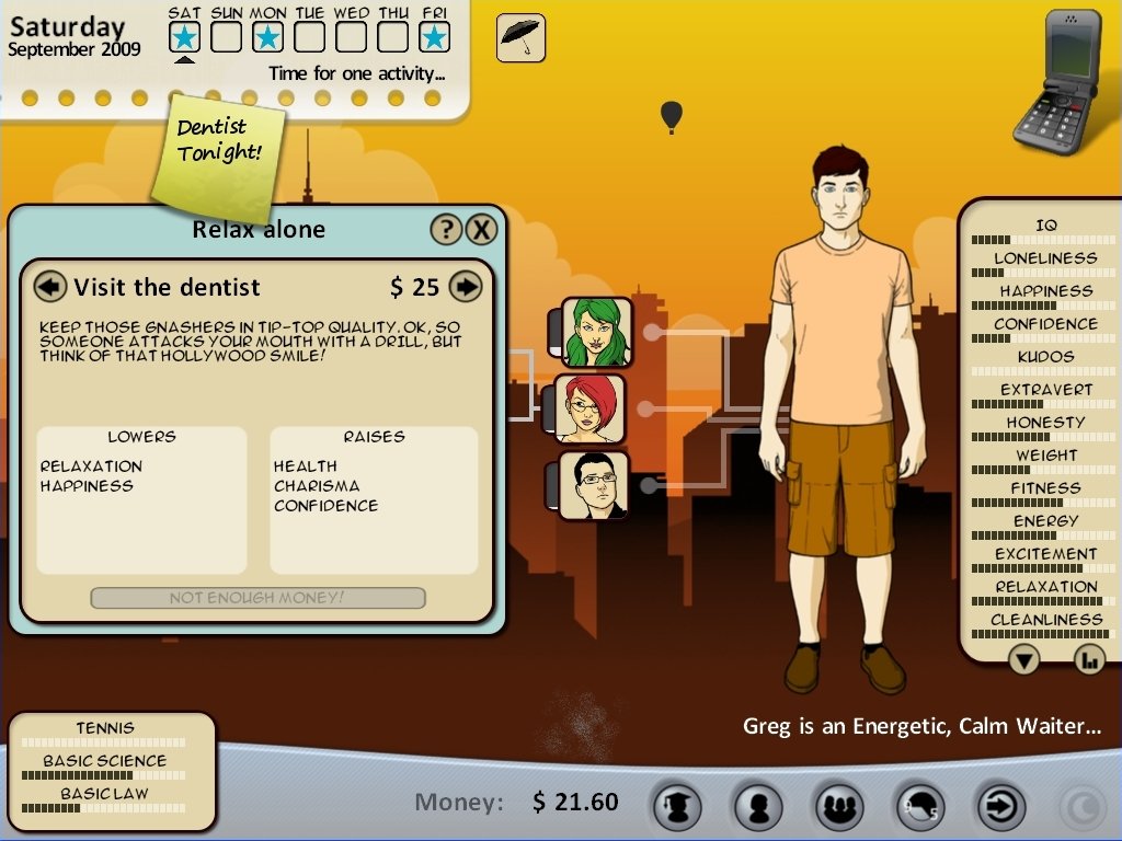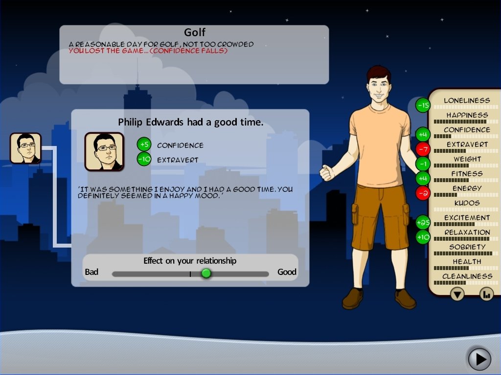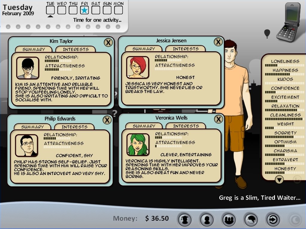 Sims. You create a character, and balance their stats and needs as you live their life. That's really where the similarities end though as we'll see. In some ways, Kudos 2 seems to have even more potential than the Sims series.