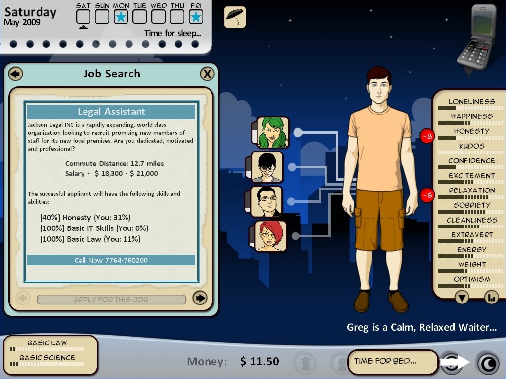 10 - After work, I pull up the stats and summaries of my four friends. Kim, Jessica, Philip, and Veronica. Veronica has green hair... and spending time with her will increase my reasoning skills. Lawyers should have strong reasoning skills, right?