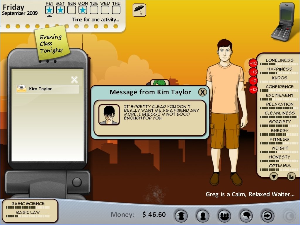 Maybe the toughest part of Kudos 2 is managing all of your character's stats! There are 20(!) individuals stats, each affecting something in your life. Balancing them seems to be pretty difficult: do I head out to the bar and have some fun but take a hit on my sobriety stat, which affects how well I can concentrate in class, or do I just sit home and lay on the couch? These are tough decisions and things are multiplied by so much information. I'm a numbers kind of guy, and it's taking me a while to take it all in!