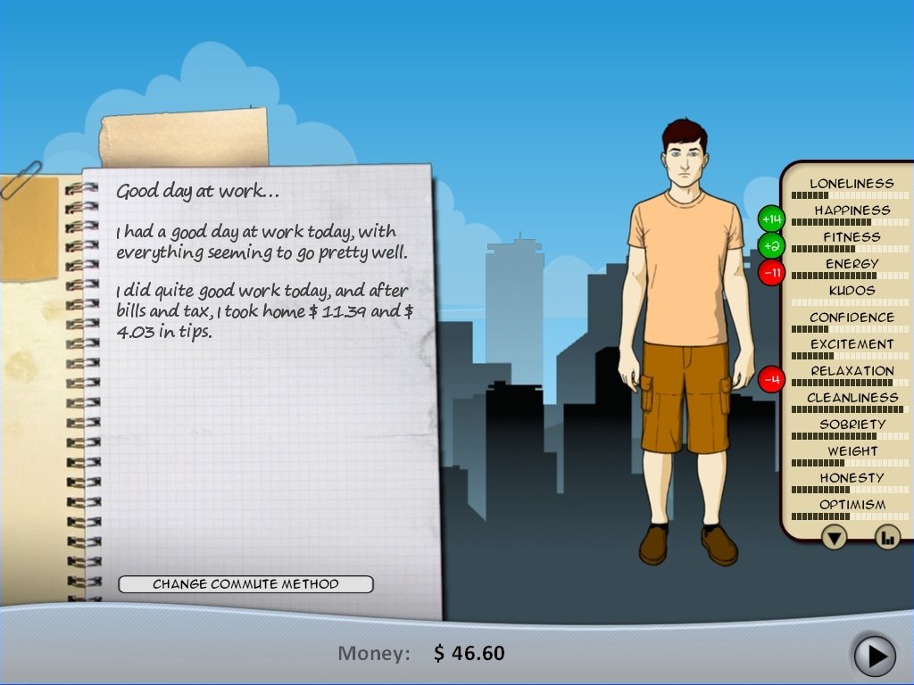 Kind of like that time you first played The Sims, and you didn't know about money cheats or anything like that, and you had to put up with a ton of crap just to get by. That's what the first hour of Kudos 2 is like. Money is short, time seems to fly by, and you're still just a waiter at a crappy dead end job. It's a little too much like real life sometimes! Also, this definitely is not a 2D Sims clone. While Kudos 2 and The Sims share plenty of similarities, Kudos 2 seems like a much deeper game. I look forward to keep playing, and I will also get my wife's impressions of the game, since she's been playing it non-stop the last couple of days. Try this game out, there's a free demo over at the