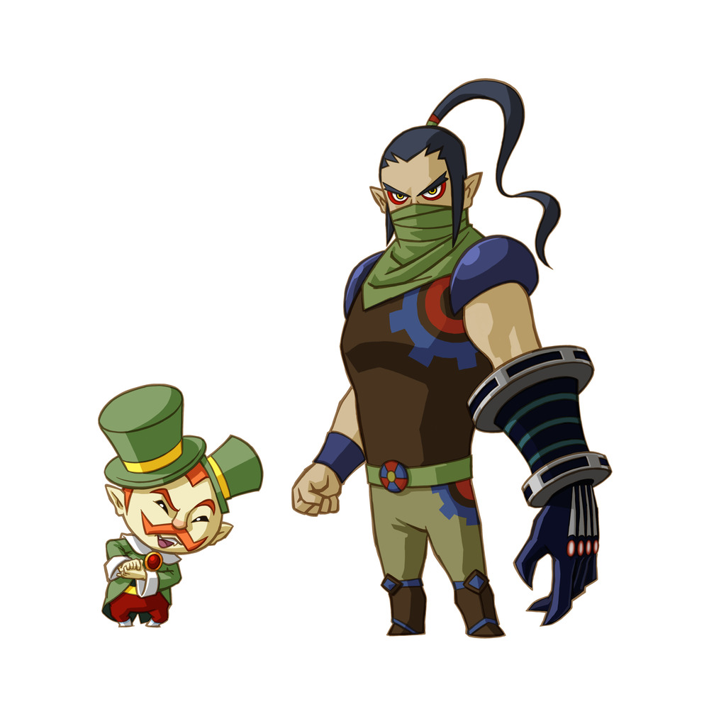 30 - Another dark cloud. It's a big skull-headed train flying through the air! It flies right over their heads, and Link displays the range of his acting abilities by making some great facial expressions. Alfonzo pulls out a sword as Chancellor Cole's hats fly off to reveal horns on his head. A tall dangerous-looking guy with a mechanical hand steps up behind him.