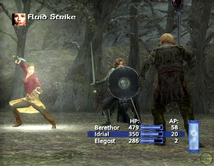 13 - Idrial attacks first because, c'mon, she's an elf. She can attack or use Swordcraft or Spirit Powers, both of which cost Action Points (AP), with 74 being Idrial's total amount. She only has one Swordcraft move, a Fluid Strike costing 20 AP. As far as Spirit Powers go she has the Loudwater fury (that's what she used on the Ringwraiths, I believe) and the Gift of Elrond, a healing move. These cost 50 AP. On the right-hand side of the screen there's a list detailing the order in which all the participants of the battle will move. Choices I make can affect the order, for example, if Idrial uses a Spirit Power, she won't attack until the end of next turn, instead of the beginning. Some interesting strategy could arise there.