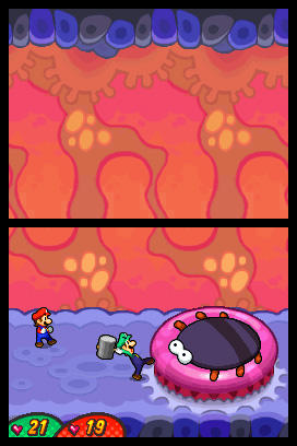 21 - Starlow tells me that we are in Bowser’s body (I could’ve told you that). A save block is in the next room, so I use it and venture on. I see another one of those goombas walking around, so I jump on him to initiate the battle. Since I hit him on the field first, I get a bonus attack at the beginning.