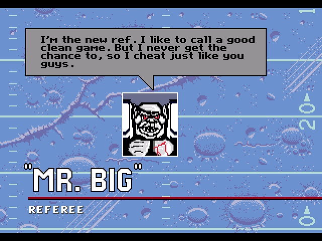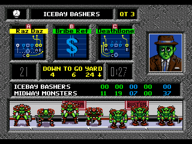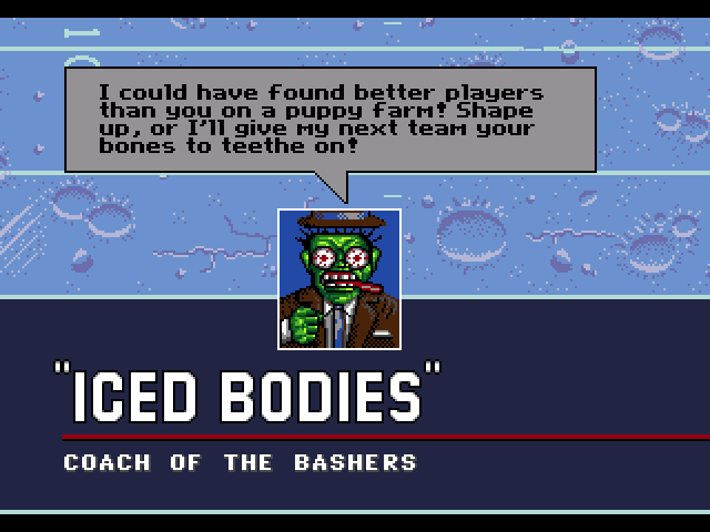 This game has a pretty unique style going for it. I think Mutant League Football's most memorable graphics are the coaches! They have some pretty funny facial expressions, especially when you're as bad as I was. Plus I'm pretty sure the Icebay Bashers (Green Bay Packers) head coach is a pretty good parody of Vince Lombardi, the hat is unmistakable.