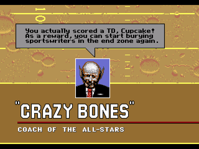games, but you can tell the development team really had some fun with the game. A few of the team names are mocking real teams (Sixty Whiners instead of 49ers) and there are a couple of parody players such as Reggie Fright (Reggie White) and Bones Jackson (Bo Jackson).
