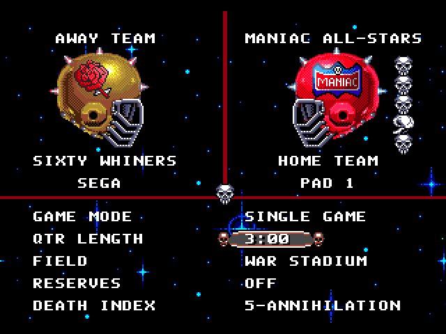 49 - This time I'm playing as one the best teams, the Maniac All-Stars, against the worst, the Sixty Whiners. Death index is maxed out and we're at War Stadium.