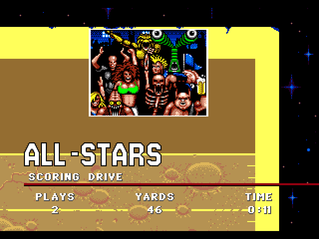 Mutant League Football really failed to impress here in its first hour. I was expecting an all out battle on the football field, with obstacles all over and players ripping apart other players every other play. I didn't really get this satisfaction until the last ten minutes when I played as the league's all-stars and battled the worst team and had cranked up the death factor to the max. Then I had fun. But maybe I just suck at football games that aren't called Blitz.
