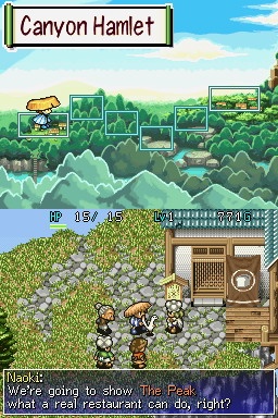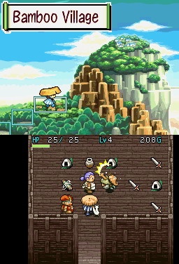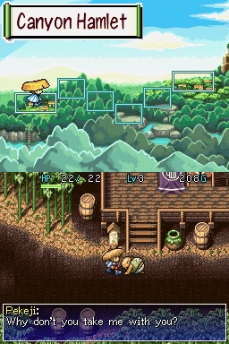 An important part to consider when developing or porting a Nintendo DS game is effective use of both screens. Mystery Dungeon does not use the top screen well at all, it's just an overall map that is useless. I would rather see my current stats or maybe place the mini-map up there instead of overlaying it on the bottom screen. The graphics are also pretty simplistic, I don't know how they compare to the original Super Famicon version but the grid-based gameplay and a relatively confined playing area don't hold this game back as much as you would think.