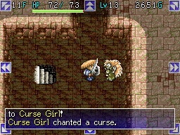 There isn't much story in Mystery Dungeon beyond the opening cutscene, and there's not much meat there either. We have this wanderer named Shiren who is accompanied by a talking weasel. Shiren says his motivation for wandering and finding the golden city is because of his friend, who has died or something. My favorite aspect of this game's story is that there are also a lot of other wanderers/warriors hanging out in the levels, doing their thing. It reminds me of