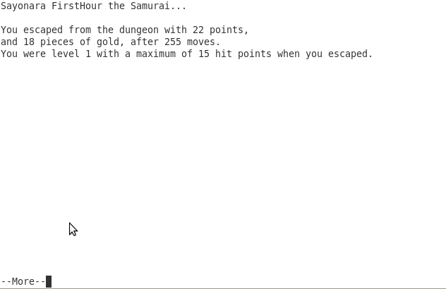 00 - I start a new game on nethack.alt.org and the game first asks me if it would like me to select the character race, role, gender, and alignment for me. Nah, I'd like to see the options. Wow, a whole bunch of classes to choose from, I'll try Samurai. A male... no options for race and alignment. Probably a good human. I get an excerpt from the Book of Amaterasu Omikami. Amaterasu wants the Amulet of Yendor, and it's my job to get it for her.
