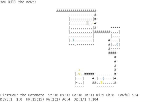 30 - Stuck again I think. Another new game, without even a decent death! Hey, killed a newt right away! Then I pick up a scroll labeled YUM YUM. What's it do?