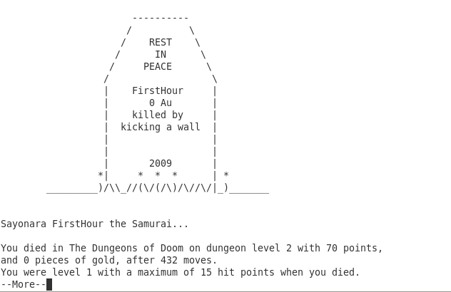 computer game infamous for its permanent death and complex gameplay. The free and open source game was released over 20 years ago in 1987 and the game is still in development. There's a huge community still playing NetHack, producing patches, and even forking the source to make new and wildly different games. The game has been ported to just about every platform known to man, and can be played online on any machine that has telnet. I could go on and on about the depth of its gameplay, challenging puzzles and enemies, or its ASCII graphics, but