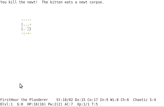 42 - My barbarian is accompanied by a kitten, who has a taste for flesh as I kill a newt, the kitten eats its flesh! I kick down a door (fun!) and kill a kobold zombie. Weird.