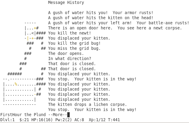 45 - This game has already been quite varied! I killed a lichen, and then immediately after a grid bug. Then my kitten picked up the lichen corpse!
