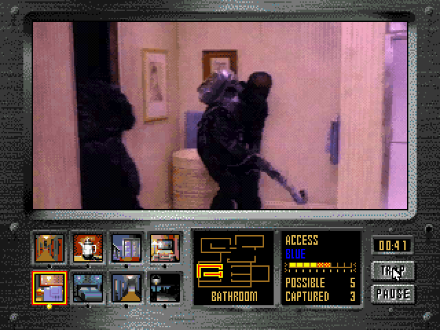 01 - But they're not SWAT, they're SCAT. I don't think I could have possibly thought of a worse squad acronym. A man named Simms starts talking to me about this slumber party that's about to go down. Five teenage girls are going to a mall friend's house for some fun, but this isn't any normal random set of people, pretty girls have disappeared from here before! My job is to protect the five girls. Somehow SCAT already snuck someone into the house and discovered a robust security system with cameras and traps in every room (including the bathroom) and they spliced the cable so we could also control their security. Right now the trap's access code is simply set to Blue, but anyone could change it at anytime, so I have to pay attention. They could also cut the spliced cable.