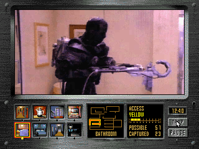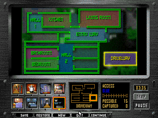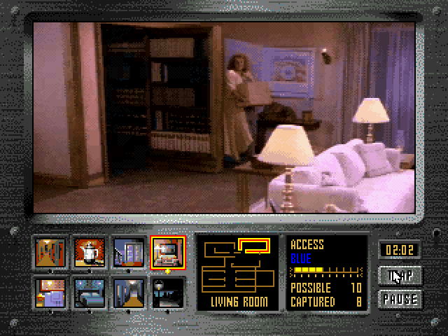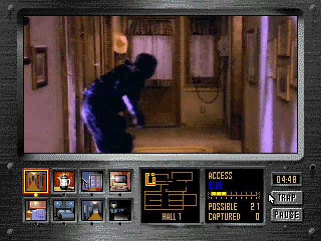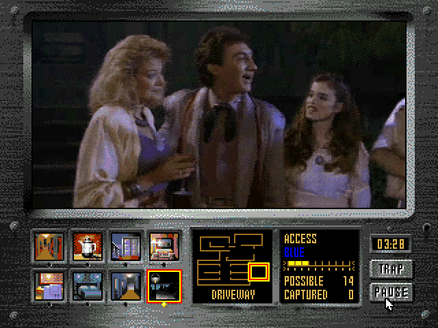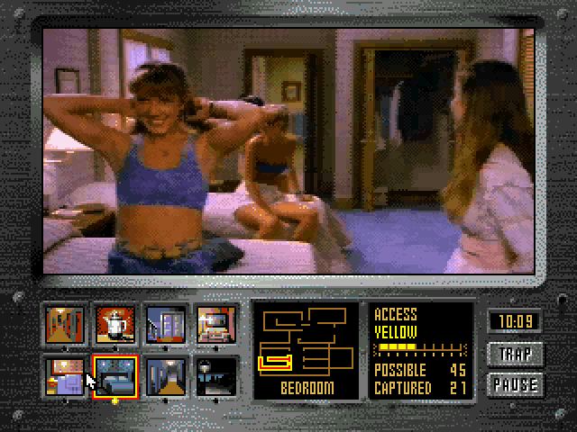 05 - I should explain the UI, on the top half of the screen we have the full motion video area, where we get to see the grainy, low-res hotties in action. On the bottom half we have what looks like a view of the house and buttons for the various cameras around the building. It also shows my current access code, and some numbers that say Possible (15) and Captured (0). Every time the game beeps the Possible goes up by one.