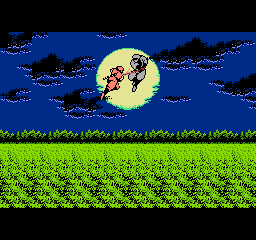 00 - Begin Ninja Gaiden NES. I was about to press Start to begin the game, when a story cutscene began! Two ninjas are facing each other in a green field with a giant moon overhead. They begin running at each other with the game just showing their legs moving at high speed.