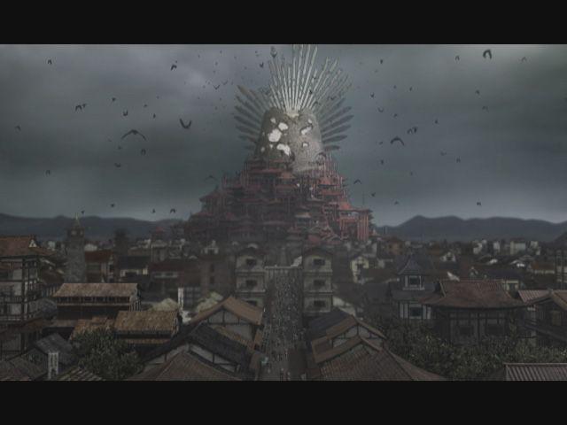 02 - Tenkai strikes back and stabs Mitsunari with his polearm, but then Mitsunari swings him around and throws him off the building. Only if the Black Oni arrives will his plan be stopped, Mitsunari announces to no one in particular. Foreshadowing. We switch to a town scene, in the distance is a giant castle with something evil looking growing out of it.