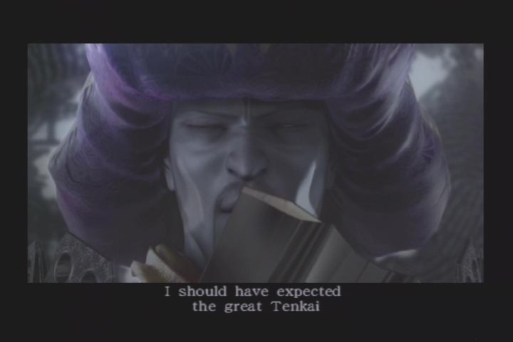 01 - The Onimusha-clad warrior is Tenkai. They exchange words for a long time and then finally do battle. Mitsunari defends himself well and then sends a wave of giant centipedes at Tenkai and holds him in the air, dangling.
