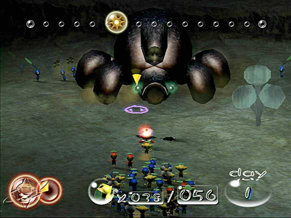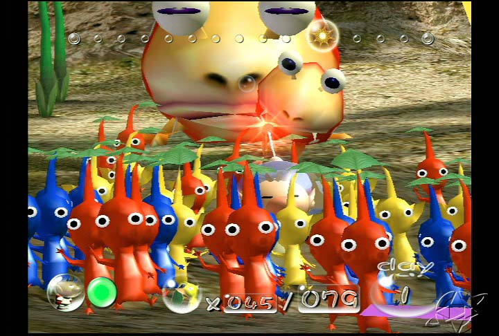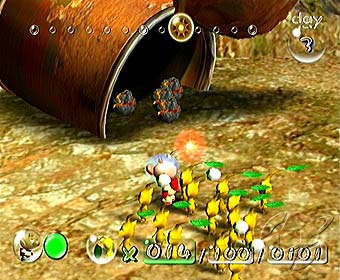 Typically, when developers try to do real-time strategy games on consoles, they pretty much do a direct port from a PC game. This almost always fails horribly. Really horribly. Pikmin was designed with the console in mind from the ground up though, so Nintendo always knew it would control with a thumbstick instead of a mouse, and there wouldn't be a keyboard available for shortcut keys. This means we have what is probably considered a dumb downed RTS by many PC gamers, but I think it plays great. Using Olimar as the central focus means you don't get lost while scrolling around the map, and the defocus on collecting resources means things are a lot more fast paced. It would be nice if you could have more than 100 pikmin out at a time though, guess there have to be limits somewhere though.