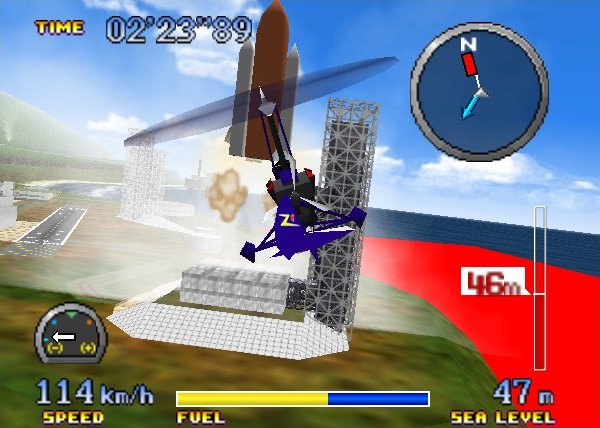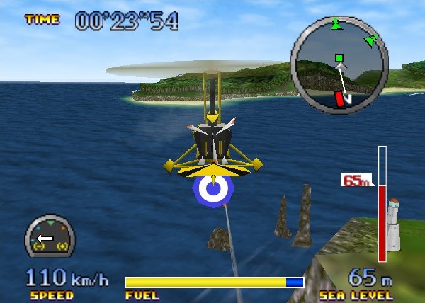 is a flight simulator and one of the original launch games for the Nintendo 64. The game doesn't feature any standard flight simulator vehicles such as fighter planes or a Cessna single-engine, but more unique craft like the gyrocopter and hang glider. There is a lot of interaction with the environments such as photographing landmarks and even some battle-themed stages pitting you against giant robots. The game was really overlooked when it was released even though there was only one other Nintendo 64 game available at the time, but of course, that game was none other than